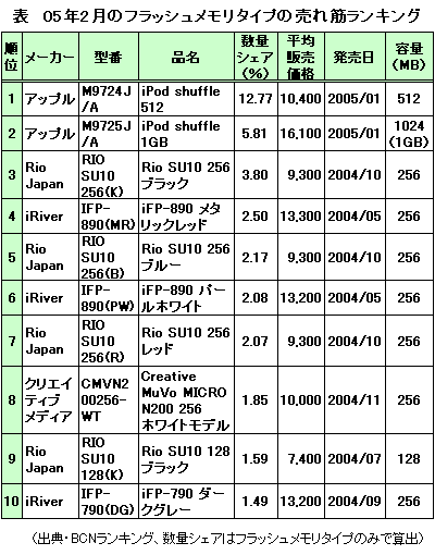 アップルの「iPod shuffle 512MB」の平均販売価格は1万400円、「同 1GB」の平均販売価格は1万6100円と、他社の同容量の製品に比べ格安となっている(表)。iRiverやクリエイティブメディアなど値下げによる対抗措置を行っているメーカーもみられ、価格面での競争も激化していくことが見込まれる。