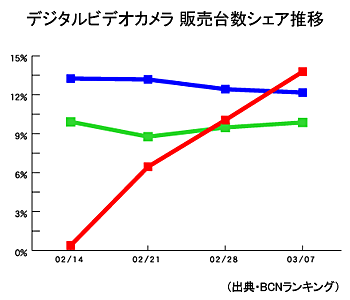 「Handycam」シリーズは、これまでデジタルビデオカメラのランキングでトップシェアを独走してきたが、今春商戦の序盤戦では、2月1週に松下「DIGICAM 250(NV-GS250-S)」にトップを譲り、同時期に投入した新製品「Handycam DCR-HC90」も最高ランクで3位にとどまっていた。しかし、3月3日発売の「Handycam DCR-DVD403」が絶好調の立ち上がりを見せ、前週(2月28日?3月6日)のランキングで2位に初登場。今回、発売2週にして一気にトップを奪取した。