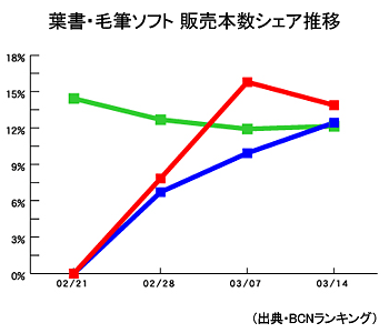 3月2週(3月14日?20日)、葉書・毛筆ソフト製品別ランキングでアイフォーの「筆王2005春 for Windows CD-ROM版」が、前週(3月7日?13日)に続いてトップを獲得した。シェアは13.9%で、提供メディアが異なる2位の「筆王2005春 for Windows DVD-ROM版」のシェアと合わせると25%を超えた。他社が春商戦向けに主力新製品を投入していないだけに、今後も勢いは続きそうだ。