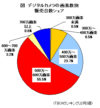一方、700万画素機の普及にともないコンデジのボトムアップが行われた結果、改めて注目されつつあるのが、少し前までの上位機種だった500万画素クラス。700万画素機を頂点とした結果、500万画素機がコンデジの大勢を占めるようになり、主流となっているのが現状だ(図)。