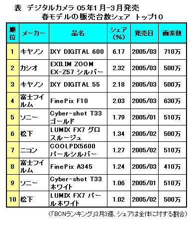 デジカメの進化はとどまることを知らない。とくに、画素数だけならばハイエンドクラスのEVF機や一眼レフに引けをとらない性能をもっているのが現在のコンパクトデジカメ、略して“コンデジ”だ。そのなかでも、大きな話題性をもって登場したのが、キヤノンの710万画素コンデジ「IXY DIGITAL 600」。「BCNランキング」から、今年1?3月発売の春モデルの販売台数ランキングを見ると、登場から1か月にも満たない段階で早くも1位をゲット(表)。700万画素という性能が、単なるエポックメイキングで終わらずにコンシュ