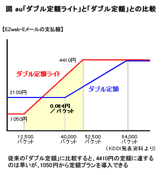 まずは、従来の「ダブル定額」と「ダブル定額ライト」の料金体系を比べてみよう。「ダブル定額」プランは、月額1050円支払うと、無料通信料が1000円分つくほか、パケット単価0.084円でEZwebやメールを使用できるという料金プラン。両プランを比較すると、「ダブル定額ライト」は、1050円分を使い切って、定額の4410円に至るまでのパケット単価は若干高い(図)。しかし、1か月のパケット使用料に大きな波のあるユーザーにとっては、パケットをあまり使わない月の通信料を以前よりも安く抑えられるというメリットがある。