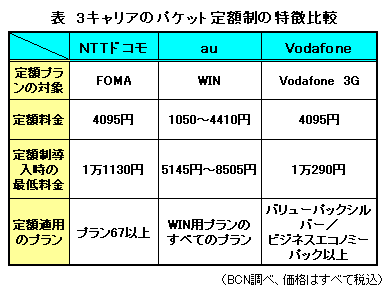 ドコモは、月額4095円の「パケ・ホーダイ」を提供している。また、Vodafoneの「パケットフリー」もドコモと同様に月額4095円。これらは一見するとauの「ダブル定額」や「ダブル定額ライト」よりも安いように見える。しかし、両社とも組み合わせられる音声プランが決まっており、ドコモだと「プラン67」以上、Vodafoneだと「バリューパックシルバー」「ビジネスエコノミーパック」以上に限られている。そのため、定額制を導入するためには、最低でもドコモ1万1130円、Vodafone1万290円がかかる計算になる。