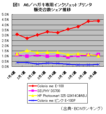 その火付け役となったのが、エプソンが昨年4月に出したインクジェットプリンタ「Colorio me: E-100」だ。それではここで、「BCNランキング」から、A6/ハガキ専用インクジェットプリンタの販売台数シェア推移を見てみよう(図1)。キヤノン、HPも昨年末に新機種を投入したが、先行する「E-100」の独走を許したまま。4位の「E-100P」も、「E-100」のピンク版で、ホワイト以外のカラーモデルが欲しいという声に応えたもの。