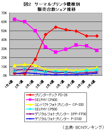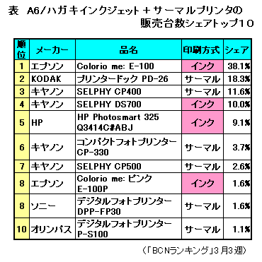 このプリンタ、単体で買えば2万円弱だが、コダックのデジカメとセットで購入する場合は、なんと3分の1程度の価格で購入できる。このため、いままでサーマルプリンタでトップを走っていたキヤノンの「CP400」は、好調な販売をキープしているのにもかかわらず、シェアを落とすことになった(表)。コダックの「PD-26」は、デジカメユーザーにターゲットを絞ったことで、新たな購入者の獲得に成功したといえる。