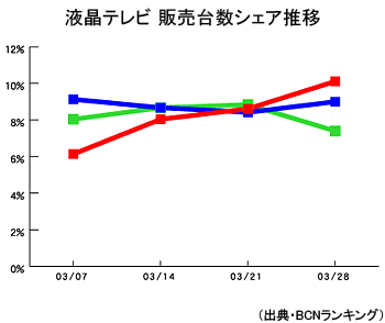 「AQUOS LC-13S4-S」は平均単価は、冬の年末商戦時点では4万円半ばだったが、その後、徐々に下がり、3月には3万円台に突入。価格が下がる前は、1サイズ大きい他社の14V型の方が“安い”というねじれ現象が起きていたが、価格低下によりそれも解消した。この結果、価格もサイズも手頃な13V型?15V型を選ぶユーザーが、“1インチ程度の違いなら「AQUOS」ブランドがいい”と判断したのか、3月に入りシェアを急上昇させた。