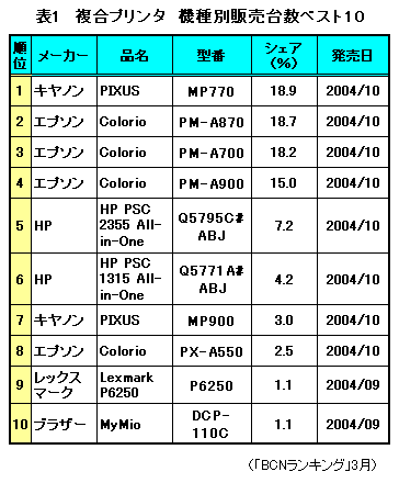 「BCNランキング」による販売台数トップ10を見ると、この3月にキヤノンの「MP770」が初めて1位を獲得した(表1)。「MP770」の機能性の高さとコストパフォーマンスの高さが高く評価された結果といえる。競合のエプソン「PM-A870」は、極論してしまえば2003年秋のハイエンドモデル「PM-A850」のマイナーバージョンアップに過ぎず、新味に欠ける。一方「MP770」の機能性は実にアグレッシブで、そして多彩だ。自動両面印刷、マルチペーパーハンドリング、四辺縁なし印刷機能、ダイレクトプリント機能などを実装しながらも、2万円代半ばという実売価格は大いに魅力的だ。