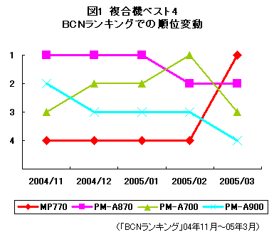 3月、プリンタの複合機市場に大きな変化があった。「BCNランキング」で、これまで4位だったキヤノンの「PIXUS MP770」が一気にトップを奪取。1年以上にわたって首位を独走してきたエプソンの牙城が崩されたのだ(図1)。これまでインクジェットプリンタでしのぎを削るバトルを演じてきた両社は、舞台を複合機市場に移し、さらに熾烈な争いを展開することになりそうだ。