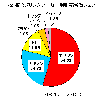 一方、メーカー別シェアでは、依然としてエプソンが過半数を握っている(図2)。ラインアップをいち早く複合機中心にシフトしたことが大きい。店頭でチェックしてみると、1万円台の「PM-A700」、2万円台の「PM-A870」、3万円台の「PM-A900」と、キレイに1万円刻みで商品が並ぶ。50%を超えるシェアは、こうしたラインアップ作戦でローエンドユーザーからハイエンドユーザーまで、幅広く取り込むことに成功した結果だといえるだろう。