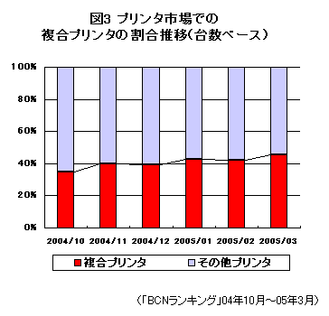 プリンタ市場で複合機が占める割合は、昨年10月に約35%であったものが、直近3月では実に46%に拡大し、いよいよプリンタの過半数に迫る勢いだ(図3)。このようにユーザーの嗜好が複合機に流れてきているのは明確であるだけに、各社発表する春モデルでは、複合機の一層の強化が予測される。この一手はプリンタ市場の主導権争いに大きな影響を及ぼしそうだ。(フリージャーナリスト・竹内亮介)