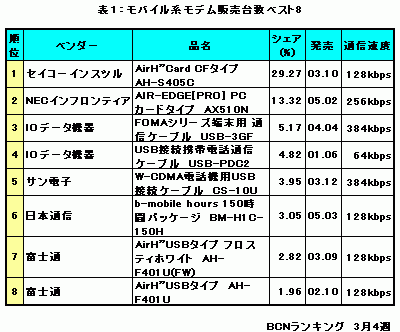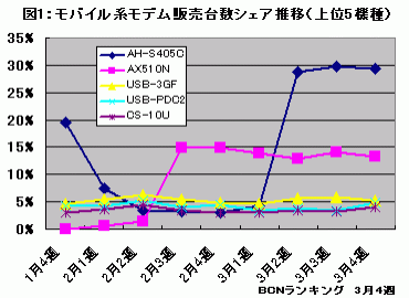 NECインフロンティアの「AX510N」は新サービス「AIR-EDGE[PRO]」に対応する最初の端末。PHSとしては高速の256Kbpsパケット通信に加え「メガプラス」による1Mbpsクラスの体感速度を実現する。発売は2月18日だが、その直後の2月第3週にいきなりトップに踊り出た。その後定番の、SII「AH-S405C」にトップは明渡したものの、モバイル系モデムで15%弱のシェアを維持しながら好調に推移している。