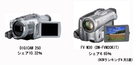 松下の「DIGICAM 250」は、「手ブレに強い、動画がキレイ、静止画がキレイ」が特徴。独自の光学式手ブレ補正機能とともに、業務用ビデオカメラクラスの3CCD方式を搭載。310万画素で静止画も撮影でき、デジカメとしても十分「使える」。このほか、モード切替することなく、動画からワンボタンで写真にできる「動画/静止画同時記録」や、暗いところでの撮影に適した「ナイトビュー」も搭載している。