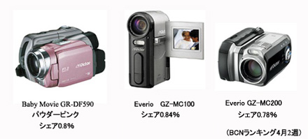 ビクターの「Baby Movie GR-DF590」は、クリアシルバー、シルキーホワイト、パウダーピンク、アクアブルーと、ビデオカメラらしからぬカラー展開で女性ユーザー獲得を狙っている。「おしゃれなママのお気に入り」というコピーどおり、やさしい色合いは実際女性にウケているようだ。