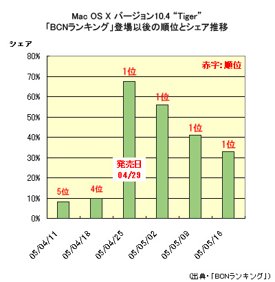 4月29日、Macユーザー待望の新OS、Mac OS X バージョン10.4「Tiger」(以下「Tiger」)が発売された。それから約1カ月。売れ行きは依然好調だ。発売直後の爆発的勢いこそやや落ち着いてきたものの、BCNランキングの販売本数シェアでは相変わらずビジネスソフト・OS部門の1位を独走している(図)。