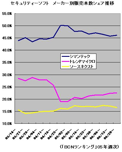 事件の影響が大きかったのは、やはりトレンドマイクロだった。店頭のPOSデータを集計する「BCNランキング」では、個人ユーザーを対象とする「ウイルスバスター2005」を中心に、同社の売り上げが一時大きく落ち込んだ。