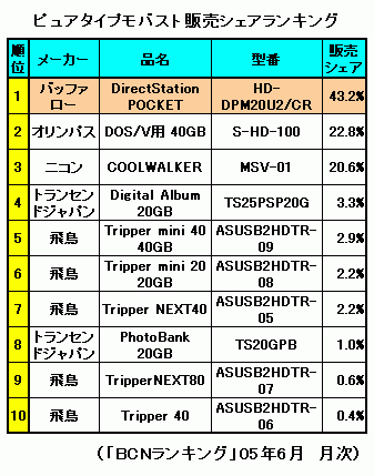 PCなしで大量のデータをバックアップできるモバストだが、大きく分けて2つの種類がある。ひとつは「ピュアタイプ」。ただひたすらデータのバックアップに特化したモデルだ。カメラメーカーやメモリカードメーカーなどの製品に多い。ほとんどの機種がメモリーカードスロットを備えており、カード経由でのバックアップが行える。小型の液晶で簡単な画像のチェックができるモデルもある。「BCNランキング」05年6月度で、このタイプのモバスト売れ筋ランキング1位はバッファローのDirectStation POCKET「HD-DPM20U2/CR(20GB)」。10種類のメディアに対応するカードリーダを搭載しながら145gと軽いのが特徴だ。