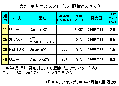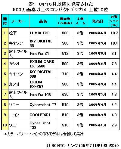 夏休みに向けデジカメを手に入れようと思いつつ、店頭に並ぶさまざまなデジカメを前に正直どれを選べばいいのか皆目見当もつかない……。そんな人も多いことだろう。そこで、趣味人が使うデジカメという独断的視点から、フリーカメラマンから見たおすすめデジカメをピックアップした。今売れ筋のコンパクトデジカメ(コンデジ)として、04年6月以降に国内メーカーが発売した500万画素以上の機種に絞り、BCNランキングとともにいくつかご紹介してみたい。