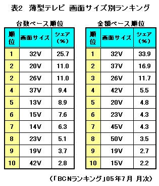 現在、薄型テレビの売れ筋ラインは32V型。「BCNランキング」の薄型テレビ部門・機種別の販売台数ランキングでもシャープのAQUOSの32V型が同率でトップになるなど勢いがある。同AQUOSの13V型と首位で並んでいる形になってはいるが、総売上金額のランキングに目を転じると、32V型はダントツ。2位は37V型だ。
