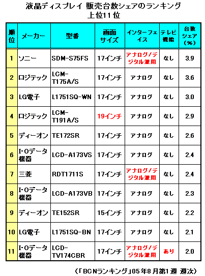 ちなみに上位11位中、唯一の19インチモデルである「LCM-T191A/S」は、この「LCM-T175A/S」の上位モデル。画面サイズのほか、輝度、コントラスト比、応答速度などが強化されている。17インチは04年10月発売だが、19インチはこの6月に発売されたばかり。1位には及ばないものの、急激にシェアを上げてきている。19インチで実売3万円台、となれば人気の理由もうなづける。