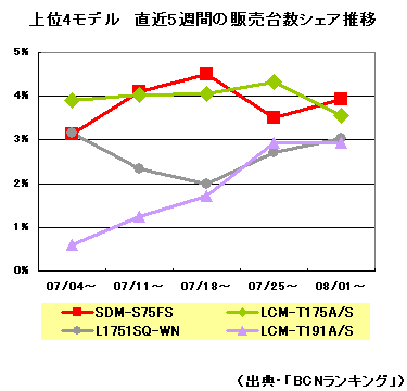 PCとデジタル接続すれば、通常、アナログ接続よりきれいに表示することができる。DVD再生や、テレビ試聴を考えるとこちらのほうが有利だ。そのため最近の上位モデルでは、デジタル・アナログ両対応が標準になりつつある。しかし、グラフィックボードとの相性という問題もあり、まだ万能とはいえない。アナログ接続モデルに比べて価格はやや高め。それでも「SDM-S75FS」は、7月第3週に初の首位を獲得したあと、第4週1位、最終週2位、8月第1週1位と人気を保っている。発売当初から兼用モデルとしてはリーズナブルな価格設定だったうえ、ここにきて20%ほど価格が下がり、値ごろ感が高まったことも好調の要因とみられる。