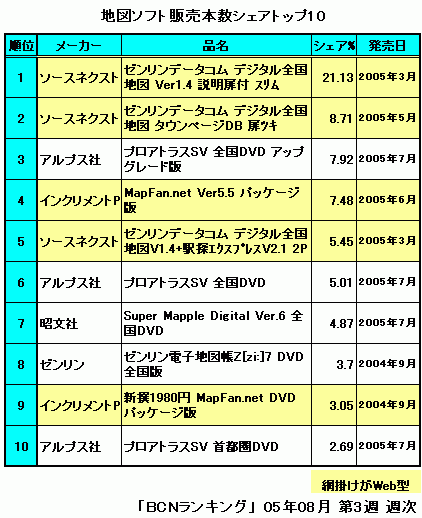 ソースネクストの「ゼンリンデータコム デジタル全国地図」や、インクリメント・ピー社の「MapFan.net Ver5.5 パッケージ版」、「新撰1980円 MapFan.net DVDパッケージ版(9位)」などがいわゆるWeb型。サイトの利用権は1年に限られるものの価格が1000円台からと格安なのも魅力だ。合併が続く今年度一杯は高価なソフトは買い控え、情報が常に最新のWeb型の廉価ソフトでまかなおうとするのは賢明な判断だろう。なにしろ2005年10月1日に合併・編入が予定されているものだけでも、全国で51ヶ所。その日だけで100あまりの市町村名が地図から消えるのだ。市町村合併とブロードバンド環境の整備。このふたつの要因がダウンロード型地図ソフトの台頭を促し、今後のメインストリームになりそうな勢いだ。