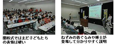朝10時に開校式がスタート。子どもたちと家族は別々の席につく。主役はあくまで子どもたちだ。その後の組み立ての場面でも親は見守るだけ。部品を支えたりする「助手役」になることはできても、組み立てには手を出さないのがルールとなっている。それだけにサポートする社員たちは大変だ。さまざまな場面で、子どもたちにも十分理解してもらえるように、あの手この手の工夫を凝らしている。開校式では、スクリーンを使ってパソコンの仕組みについて説明するのだが、そこでは、ネズミのチュー太くんや物知り博士に扮した社員が登場して、寸劇仕立てで説明を行う。子どもたちの笑いを誘いながら、この日行う組み立て作業がどんなものになるのかをわかりやすく伝えていく。