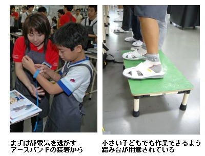 子どもたちは、静電対策エプロンを身につけ、アースバンドを手首に巻いてから、組み立て作業に取りかかった。3人の社員が同時進行で同じ作業を行い、その模様は3つのスクリーンに投影されている。子どもたちがどの位置からでもスクリーンが見やすいように、全員がそろって同じペースで作業が進められるように、とスタッフ全員で取り組んでいる。子どもたちの手元には、作業手順を写真とイラストでわかりやすく図解した説明書が配られている。これも毎回すべて社員が手づくりしているものだ。そして、指導員役の社員が子どもたちのそばでマンツーマンに近いサポートを行っていく。