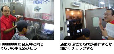 午後はまず、グループごとに工場見学へ。「Let's note」や「TOUGHBOOK」の耐久試験設備、プリント基板の印刷装置などを見学する。気温80度、湿度95%の試験室の中で正常に稼働を続ける「Let's note」、雨の中でずぶ濡れになっても、1mの高さから落としてもびくともしない「TOUGHBOOK」を目の当たりにして、子どもたちは一様に驚いていた。