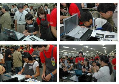 02年にスタートして今年で4年目の『手づくりLet's note工房』。今年は、50人の募集に、青森から宮崎まで約700人に上る応募があった。その中から抽選で選ばれたのは男の子27人、女の子23人。一番小さい子が9歳の小学生、最年長で18歳の高校生だ。なかなかの「狭き門」だが、実はスタッフも希望者が多すぎて「抽選」で選ぶのだという。神戸工場の社員たちも年に1度の「工房」を、とても楽しみにしている。日ごろ生産の現場で働いている彼らが、子どもたちと一緒に「ものづくり」を体験できる貴重なイベントだからだ。