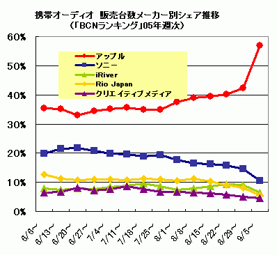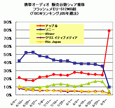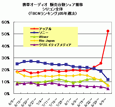 本命のシリコン部門ではどうだろう。8月の第3週までは、ソニーが首位の座にあったこのカテゴリーだが、アップルが首位を奪還したのが8月第4週。以来両社の差は大きくなる一方だった。nano 発売でその差は決定的となり、アップルはこのカテゴリーを一挙2倍に拡大させ、過半数を制覇する52.3%のシェアを握った。