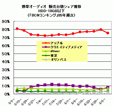 アップル撤退後にシェアを伸ばしているのは、クリエイティブメディア。2.5%の伸びではまだ物足りないが、これからに期待が持てる。一方で、HDD10GB超の大容量タイプでは、ソニーや東芝が若干シェアを伸ばし、アップルは若干シェアを落としている。しかしいずれも1%に満たない動きであり、このカテゴリでーはアップルの強さにほとんど変化はない。