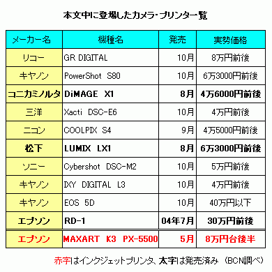 ほかにもコンデジでは、独自の手ぶれ補正機能「Anti-Shake」を搭載したミノルタの「DiMAGE X1」、コンデジ最大の3.0型液晶モニターを持つサンヨーの「Xacti DSC-E6」、「COOLPIX 900」から続くニコン伝統のスイバルデザインが復活した「COOLPIX S4」、広角28mmで世界初のアスペクト比16:9というCCDを搭載したパナソニックの「LUMIX LX1」、まるでケータイ電話のようなフォルムのソニー「Cybershot DSC-M2」、そして、ついにズームを搭載して思い切ったカラーリングを施したキヤノンの「IXY DIGITAL L3」と気になるカメラは枚挙にいとまがない。