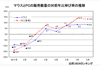マウスの販売動向は、PC需要とリンクした動きをたどり、PC販売が好調な際には、マウスの販売も上向きになる傾向がある。そのため、マウス販売が数量ベースで4月以降プラスになったが、これは春以降PC販売が数量ベースで堅調に推移していることが背景にある。