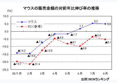 春以降、台数では前年を上回って推移するPC販売だが、価格の下落にともない、金額ベースでは依然厳しい状況が続いている。その一方、PC周辺機器、とくに最も身近な存在であるマウスが堅調な動きをみせている。そこで、「BCNランキング」をもとに、最近のマウス市場の動向についてまとめた。