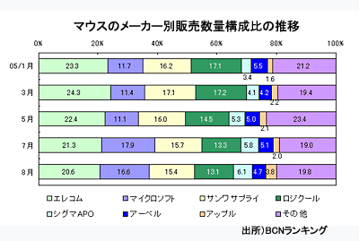 この間、マイクロソフトで突出していたマウスは「Microsoft Wireless Notebook Optical Mouse Mica Black」。7月が2位、8月が7位であった。また「Microsoft Basic Optical Mouse」なども上位に位置している。しかしいずれの機種も2003年または2004年発売の機種。上位の機種では「Microsoft Basic Optical Mouse USB Black」が唯一2005年6月の発売の製品で、7月が4位、8月が8位だった。
