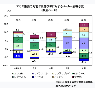 一方、その他のメーカーにも目を転じると、シグマAPO、アップルの2社の動きが目立つ。いずれもメーカーシェアは2?6%程度ではあるものの一貫してプラスに寄与している。シェアは低いながらも、アップルのマウスはこれまでマックユーザーの強い支持によって安定的なシェアを維持してきた。しかし、ここにきてその状況は変わりつつある。きっかけとなったのは8月に発売された「Mighty Mouse」。360度と全方向にスクロールが可能なほか、MAC OS Xに加え、Windows2000/XPにも対応するなど、ターゲットも幅広い。この機種の投入により、「アップル」の寄与度は、7月の0.6%から8月には2.7%大きく伸びた。