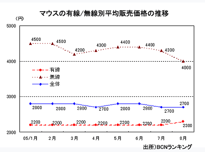 価格の動きはどうだろう。全体でみた平均販売価格は緩やかに下落しており、直近の8月では1月に比べ3.6%の下落幅。平均価格は2700円となった。有線と無線とで分けてみると、有線は2,200円あたりで安定的に推移。しかし7月から8月にかけて、5670円と有線タイプでは比較的高価な「Mighty Mouse」の投入効果などにより平均価格が上昇、2,300円となった。一方、無線は多少の変動はあるものの、下落トレンドに変化はなく、直近の8月は1月に比べ11.1%の下落幅を記録、平均価格は4000円となった。