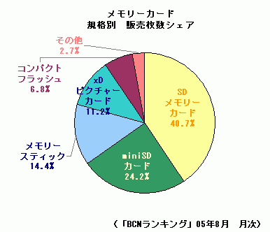 SDカードは、SanDisk、松下、東芝の3社が共同開発したメモリーカード規格。小型で薄く著作権保護機能もあり、デジカメや携帯オーディオをはじめとするさまざまな分野で対応製品が多い。大容量化が進むと同時に高速転送の製品なども増え、ムービーカメラの記憶媒体としても使われ始めている。miniSDカードはSDカードをさらに小型化したもの。その小ささを生かして携帯電話の外部メモリーとして多く使われている。また、カードアダプタを装着することでSDメモリーカードとして使用することができるため、「普段は携帯で、必要になったらデジカメで」などの使い方も可能だ。メモリースティックPRO、同PRO Duo、同Duoなどの「メモリースティック」が14.4%と販売シェア2位。メモリースティックはソニーの提唱する規格で、大容量対応の「メモリースティックPRO」や、小型の「メモリースティックDuo」など用途別に種類が多い。つい先日も、サンディスクとの共同開発による「メモリースティック マイクロ」が発表されたが、一部には「規格が多すぎて、何がなんだか分らない」との声も聞かれる。