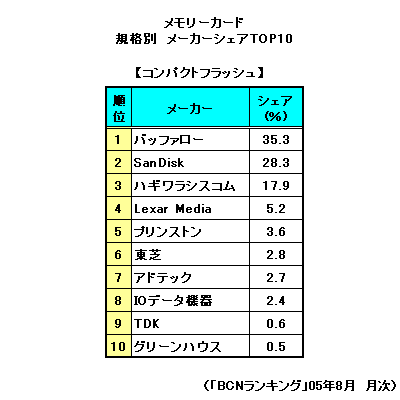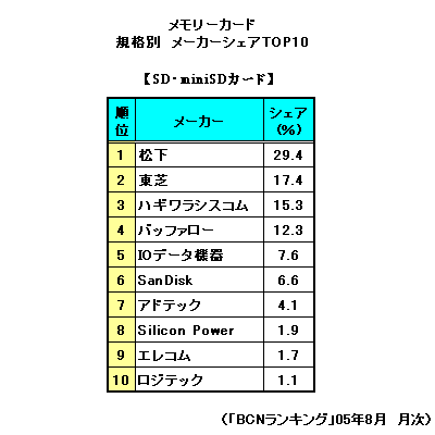 それぞれの規格別でのメーカーシェアはどうだろう。「SDメモリーカード」と「mini SDカード」を合計したシェアでは、トップが松下で29.4%、2位が東芝で17.4%となり、開発メーカーが2社が名を連ねた。一方同じ開発組の SanDiskは今ひとつ元気なく6.6%で6位。一方健闘しているのがハギワラシスコムの15.3%で3位、バッファローの12.3%で4位、IO データの7.6%で5位と続く。さすがにメモリーカード全体で7割近いシェアの規格だけに、参入企業も多い。