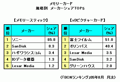 「メモリースティック」では、提唱企業であるソニーが85.8%のシェアを握りダントツだが、その他の参入企業のシェアは軒並み1桁台。参入企業も少ない。xDピクチャーカードも、富士フイルムとオリンパスで9割を超えるシェアを占め、参入企業のにぎやかさはない。一方「コンパクトフラッシュ」では、バッファローが1位でシェア35.3%。提唱企業のSanDiskが28.3%の2位で追う立場になっている。しかし、こちらはSDと同じく多くの企業が参入し、価格競争も激しくなっている。