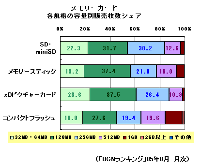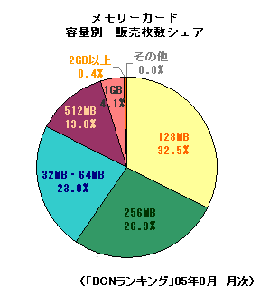 全規格での容量別シェアでは、やはり最も多いのが128MBで32.5%、次いで256MBで26.9%、合算すると59.4%となる。やはり大半がこのクラスと言えそうだ。また、32MBや64MBといった小容量のカードも依然売れており、23%のシェアを占めている。一方、1GB以上の大容量カードは4.5%。まだまだ大容量化の流れは進むことが予想され、これからの伸びが期待できるクラスといえる。