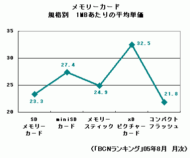 1MBあたりの平均単価は、一眼レフデジカメなどでよく使われる「コンパクトフラッシュ」が最も安かった。大容量タイプの販売枚数シェアが高いことが影響していることもあるが、1MBあたり21.8ポイントという値は、大容量化を考えると、非常に魅力的だ。