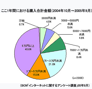 インターネットショッピングの利用経験があるとする回答者に、この1年間(2004年10月?2005年9月)のインターネットショッピングでの購入合計金額を聞いたところ、「5万円以上」(40.6%)が4割強を占め最も多く、1万円以上が全体の7割台半ばを占めている。