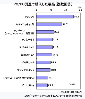 インターネットショッピングで購入したものでは、「書籍、雑誌」(56.2%)、「PC/PC関連製品(PC用ソフトを含む)」(54.6%)がいずれも5割以上と上位を占めている。また、「PC/PC関連製品」を選択した回答者に、その具体的な製品を聞いたところ、「PCソフト」(50.3%)が5割強を占めトップで、以下「PC(デスクトップ)」(34.7%)、「PCパーツ(CPU、PCケース、電源等)」(23.8%)の順となった。