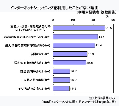インターネットショッピングの利用未経験者に、利用していない理由を聞いたこところ、「支払い・返品・商品取り替え時のトラブルが不安だから」(51.5%)、「商品が写真ではよくわからないから」(44.4%)、「個人情報の管理に不安があるから」(41.4%)をあげる回答が多く、売り手や商品を実際に見ないことなどによる不安感が大きいようだ。