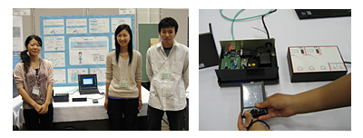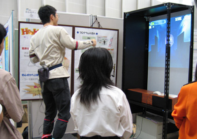 展示ブースで、不思議なものを見つけた。パソコンや計測装置などが目につくなかで、そこだけは飛んだり跳ねたりと、体育会系の雰囲気が漂っている。展示タイトルは、「Health me !! ―効っくボクサーへの道―」(審査委員特別賞受賞)。金沢高専の作品だ。スクリーンを前に、パンチやキックを繰り出したりと忙しそうだが、よく見ると腕や足にはベルトに巻かれた計測器がついている。実はこれ、加速度センサー。スクリーンに投影されるボールに向かってパンチを出すと、パソコンが速さや方向を測定。さらに消費カロリーまで算出してくれる。ゲーム感覚で楽しめるダイエットマシンというわけだ。