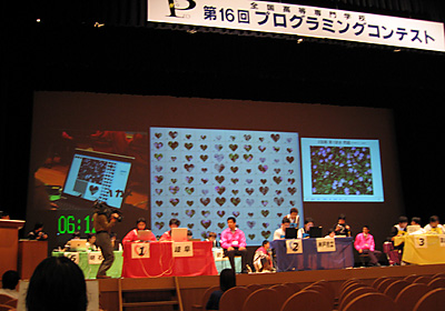 各校ごとの応募作品の展示と審査が中心の「プロコン」のなかで、唯一の勝ち抜き競技が「ハートを捜せ!」と題されたネットワーク対戦ゲームだ。舞台のうえに各校の代表が並び、出題されたテーマに対して、プログラムの精度と時間と最適解を競う。