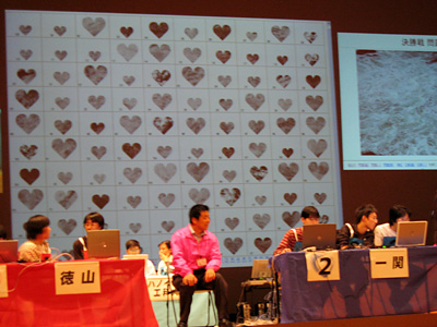 スクリーンに最終得点が表示されたとたん、会場から一斉に声が上がり、ついで拍手がわき起こった。なんとモンゴル27ハートでトップ、作戦通りの高得点だ。ついでハノイが14ハート、高専勢では久留米が3ハートでトップだった。久留米は正解率では抜群に精度の高い成績だったが、難題に最後まで苦戦を否めなかった。