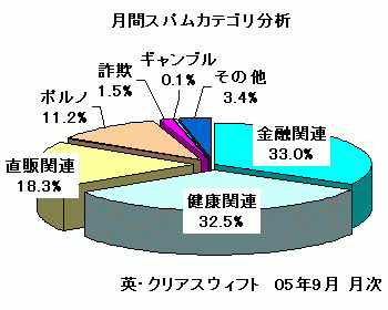 また、オンラインギャンブルが流行するなか、関連するスパムは前月の2.2%から0.01%にまで減少する、という極めて意外な結果も出ている。常連のヘルスケアも8月から9%減少し、全スパムメール中の32.5%にまで縮小した。一方、金融スパムは31%から33%に増加、商品関連のスパムの増加率は5%未満で、現在18.3%を占めている。