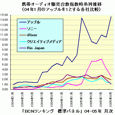 約2年にわたる時系列での販売台数推移を見るため、「BCNランキング」の「標準パネル」と呼ばれる時系列用データセットを使って分析を試みた。まず、直近の05年9月現在での販売台数シェアベスト5社をピックアップ。次に、04年1月のアップルの販売台数を1として04年1月時点での各社の販売台数指数を算出した。これをスタートとして05年9月までの各社の販売台数を指数化し折れ線グラフで表現した。